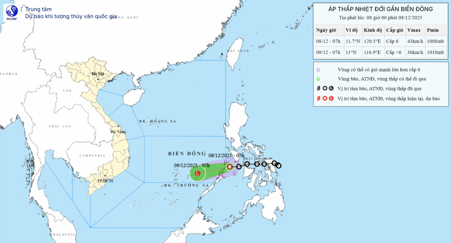 Hiện trạng áp thấp nhiệt đới: Hồi 07 giờ ngày 08/12, vị trí tâm áp thấp nhiệt đới ở vào khoảng 11,7 độ Vĩ Bắc; 120,5 độ Kinh Đông, trên vùng ven biển phía Đông đảo Pa-la-oan (Phi-líp-pin). Sức gió mạnh nhất vùng gần tâm áp thấp nhiệt đới mạnh cấp 6 (39-49km/h), giật cấp 8. Di chuyển theo hướng Tây, tốc độ 15-20km/h.
