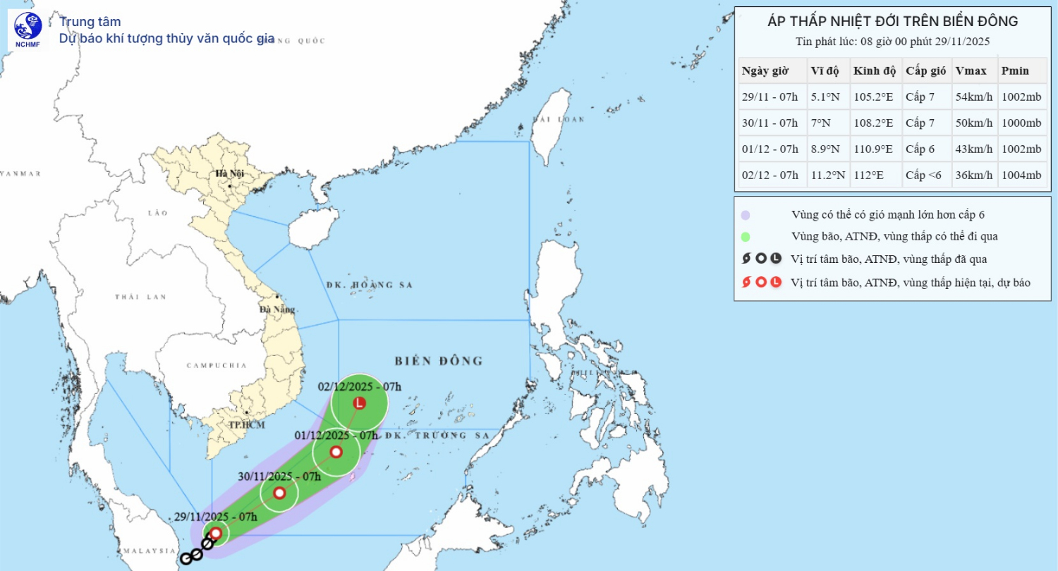 Hiện trạng áp thấp nhiệt đới: Hồi 07 giờ ngày 29/11, vị trí tâm áp thấp nhiệt đới ở vào khoảng 5,1 độ Vĩ Bắc; 105,2 độ Kinh Đông, trên vùng biển phía Tây Nam khu vực Nam Biển Đông. Sức gió mạnh nhất vùng gần tâm áp thấp nhiệt đới mạnh cấp 6-7 (39-61km/giờ), giật cấp 9. Di chuyển theo hướng Bắc Đông Bắc với tốc độ 10-15km/h.