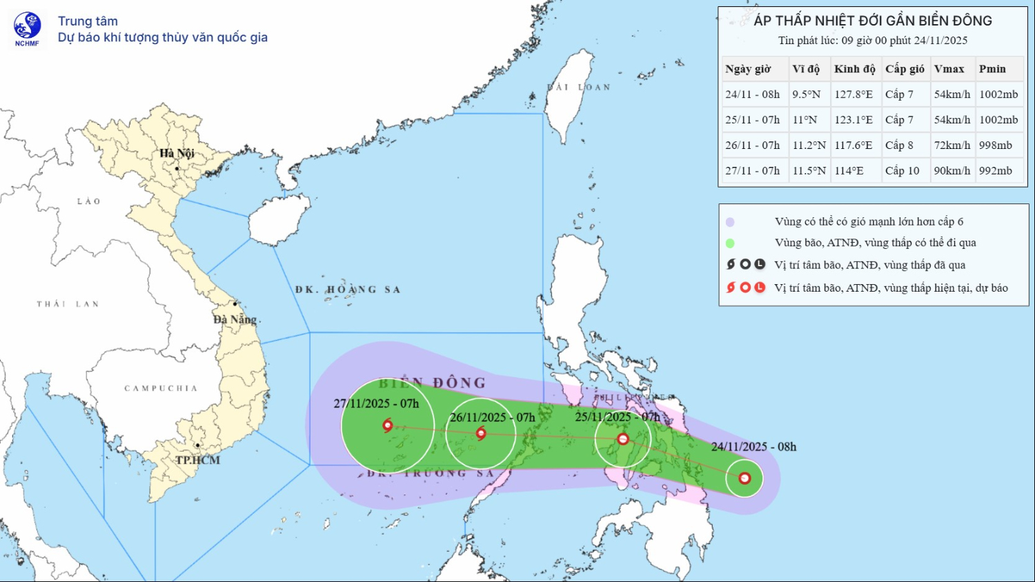 Hình1. Bản đồ dự báo quỹ đạo và cường độ áp thấp nhiệt đới phát lúc 09h00 ngày 24/11/2025