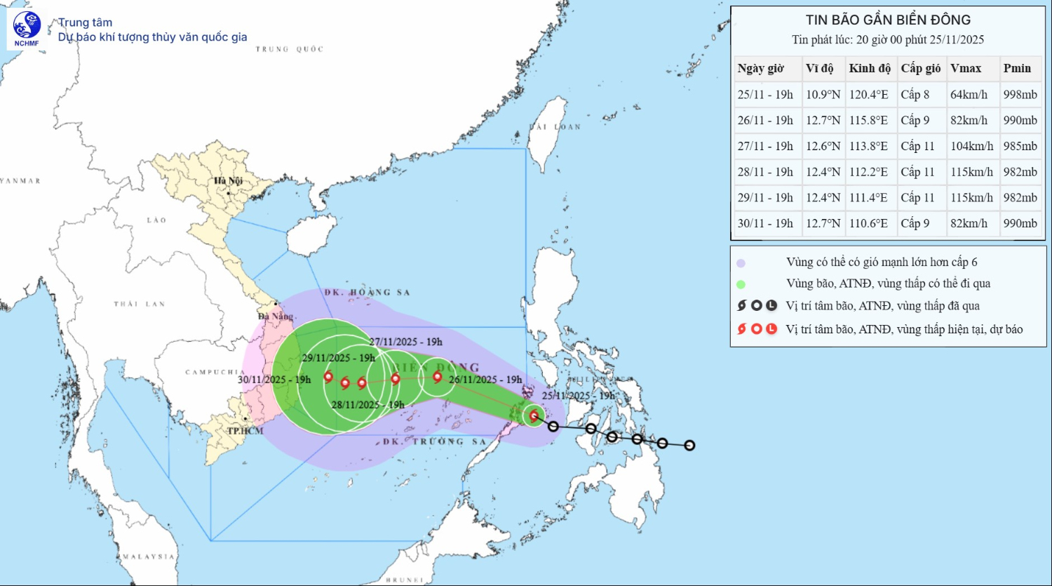 Hình 1. Bản đồ dự báo quỹ đạo và cường độ bão phát lúc 20h00 ngày 25/11/2025