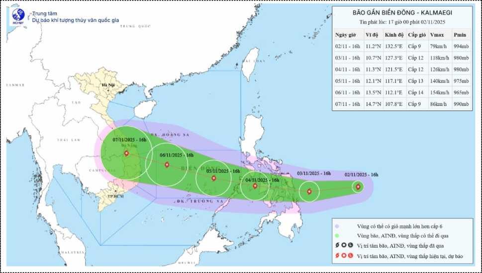 Hình 1. Bản đồ dự báo quỹ đạo và cường độ bão KALMAEGI phát lúc 17h00 ngày 02/11/2025
