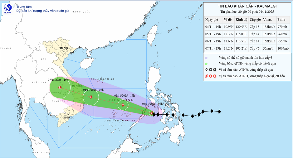 | 19 giờ ngày 05/11 | Tây Tây Bắc, 2025km/h, di chuyển vào Biển Đông | 12,3N-116,0E; cách đảo Song Tử Tây khoảng 220 km về phía Đông Bắc | Có khả năng mạnh thêm. Cấp 13-14, giật cấp 17 | Vĩ tuyến 10,00N- 14,50N; phía Đông kinh tuyến 114,00E | Cấp 4: khu vực Giữa Biển Đông (bao gồm vùng biển phía Bắc đặc khu Trường Sa) |