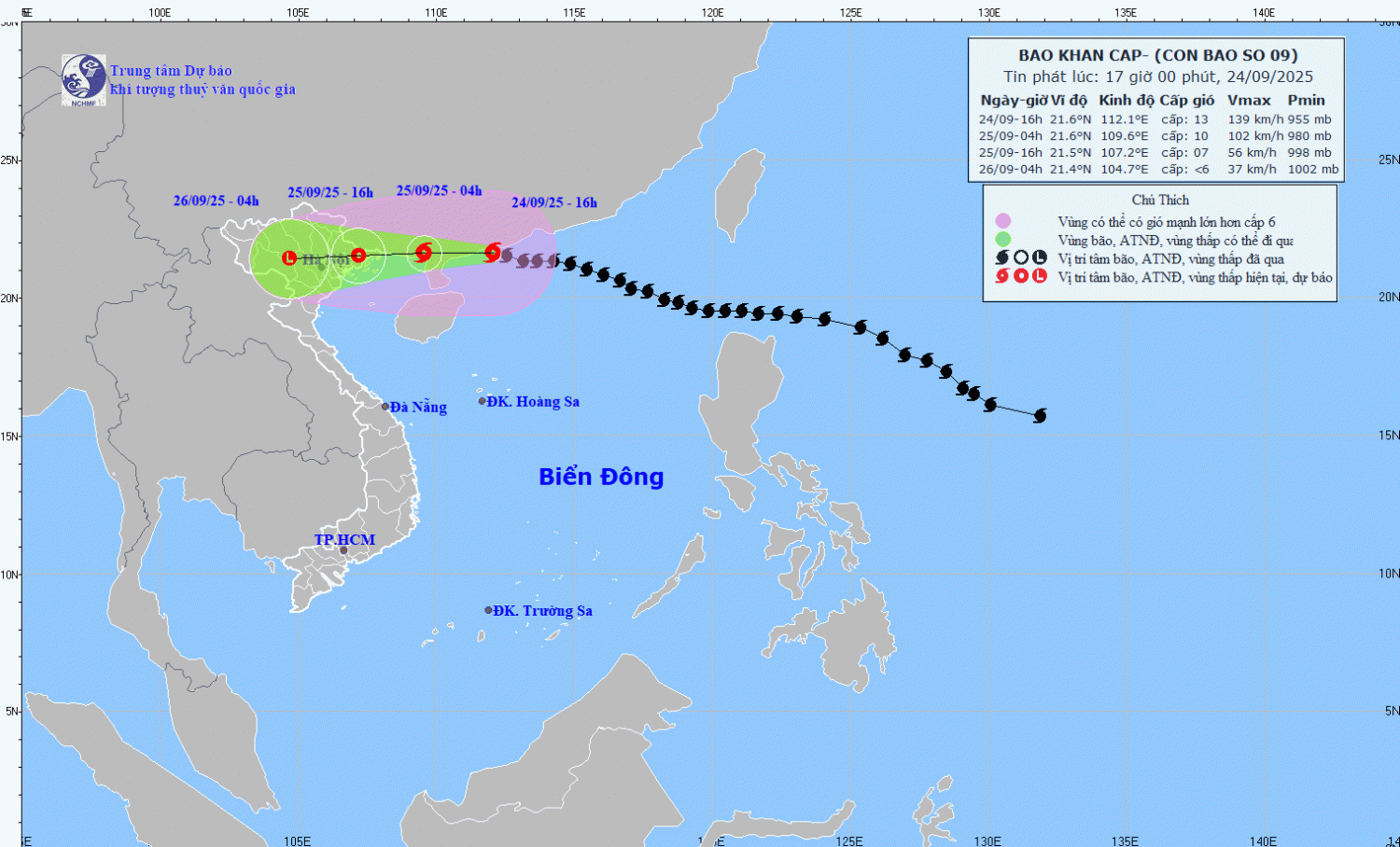 Hiện trạng bão: Hồi 16 giờ ngày 24/9, vị trí tâm bão ở vào khoảng 21,6 độ Vĩ Bắc; 112,1 độ Kinh Đông, cách Móng Cái (Quảng Ninh) khoảng 450km về phía Đông. Sức gió mạnh nhất vùng gần tâm bão mạnh cấp 13 (134-149km/giờ), giật cấp 16. Di chuyển theo hướng Tây Tây Bắc với tốc độ khoảng 20km/h.
