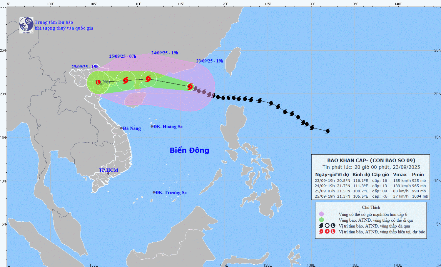 Bản đồ dự báo quỹ đạo và cường độ bão số 09 phát lúc 20h00 ngày 23/9/2025
