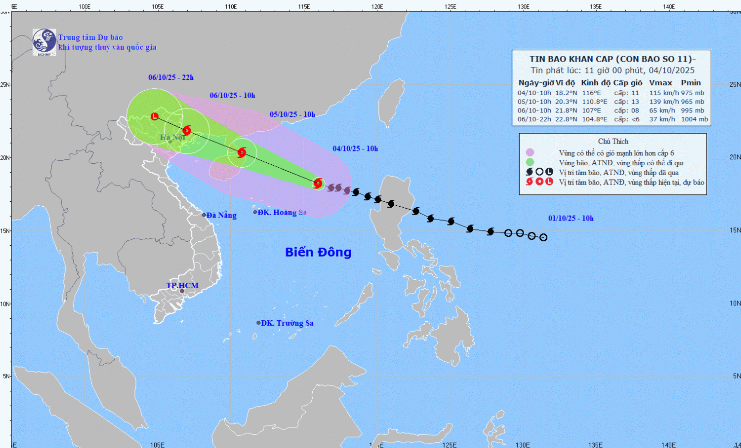 Từ đêm 05/10 đến hết đêm 07/10, ở khu vực vùng núi, trung du Bắc Bộ có mưa to, lượng mưa phổ biến từ 150-250mm, cục bộ có nơi mưa rất to trên 400mm. Cảnh báo nguy cơ mưa có cường suất lớn (>150mm/3h); khu vực Đồng Bằng Bắc Bộ, Thanh Hóa có mưa vừa, mưa to với lượng mưa phổ biến 70-150mm, cục bộ có nơi mưa rất to trên 200mm.