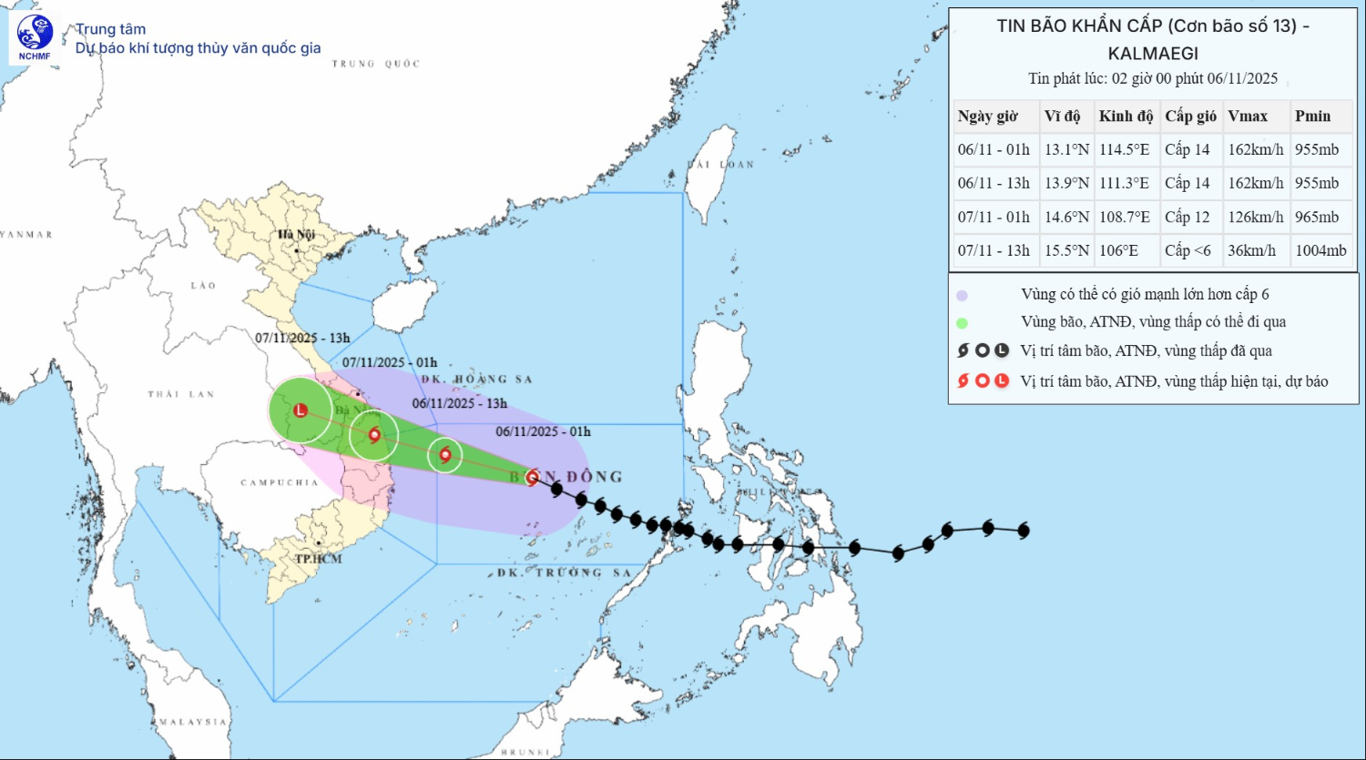 Hồi 01 giờ ngày 06/11, vị trí tâm bão ở vào khoảng 13,1 độ Vĩ Bắc; 114,5 độ Kinh Đông, cách đảo Song Tử Tây khoảng 185km về phía Bắc, cách Quy Nhơn (Gia Lai) khoảng 580km về phía Đông Đông Nam. Sức gió mạnh nhất vùng gần tâm bão mạnh cấp 14 (150-166 km/giờ), giật cấp 17. Di chuyển theo hướng Tây Tây Bắc, tốc độ 25-30km/h.