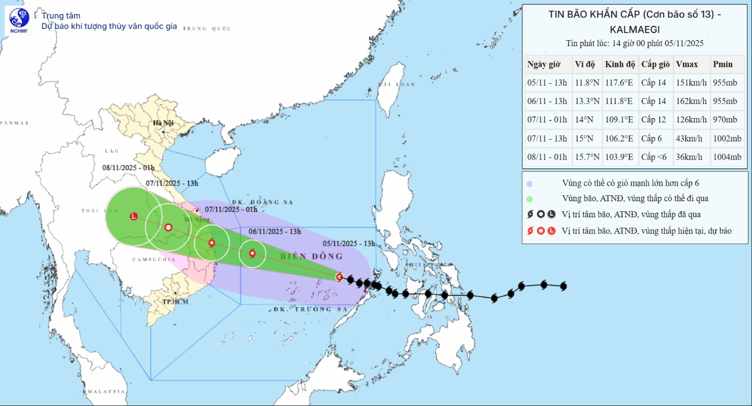| 13 giờ ngày 06/11 | Tây Tây Bắc, khoảng 25km/h | 13,3N-111,8E; cách Quy Nhơn (Gia Lai) khoảng 290km về phía Đông Đông Nam | Cấp 14, giật cấp 17 | Vĩ tuyến 10,00N- 15,50N; phía Đông kinh tuyến 110,50E | Cấp 4: Khu vực Giữa Biển Đông (bao gồm vùng biển phía Bắc đặc khu Trường Sa). |