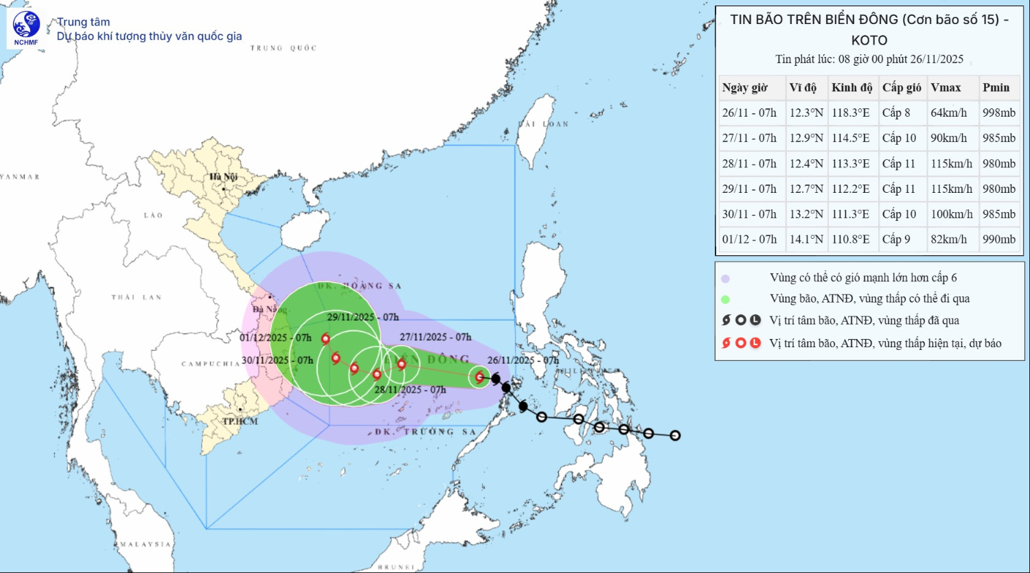 Hình 1. Bản đồ dự báo quỹ đạo và cường độ bão số 15 phát lúc 08h00 ngày 26/11/2025