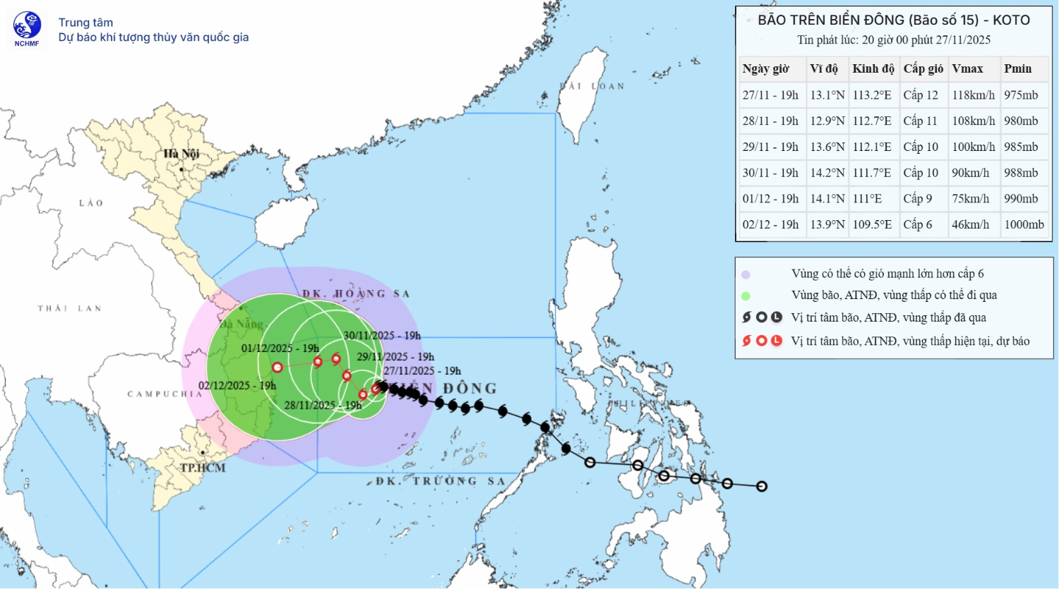 Hiện trạng bão: Hồi 19 giờ ngày 27/11, vị trí tâm bão ở vào khoảng 13,1 độ Vĩ Bắc; 113,2 độ Kinh Đông, cách đảo Song Tử Tây khoảng 220km về phía Bắc Tây Bắc. Sức gió mạnh nhất vùng gần tâm bão mạnh cấp 12 (118-133km/h), giật cấp 15. Di chuyển theo hướng Tây, tốc độ 5-10km/h.