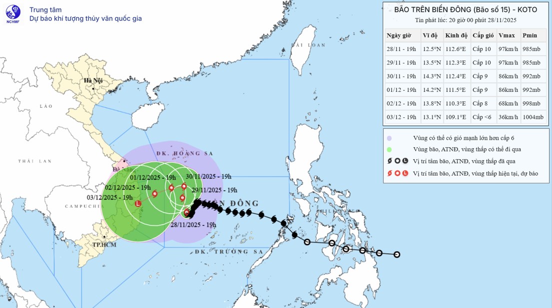 | 19 giờ ngày 01/12 | Tây Tây Nam, 3-5km/h | 14,20N-111,50E; trên vùng biển phía Tây Bắc khu vực Giữa Biển Đông, cách vùng bờ biển phía Đông tỉnh Gia Lai khoảng 250km về phía Đông | Cường độ tiếp tục suy yếu dần. Cấp 8-9, giật cấp 12 | 12,00N- 15,50N; phía Tây kinh tuyến 114,00E | Cấp 3: vùng biển phía Tây Bắc khu vực Giữa Biển Đông, vùng biển ngoài khơi các tỉnh từ Quảng Ngãi đến Đắk Lắk |
