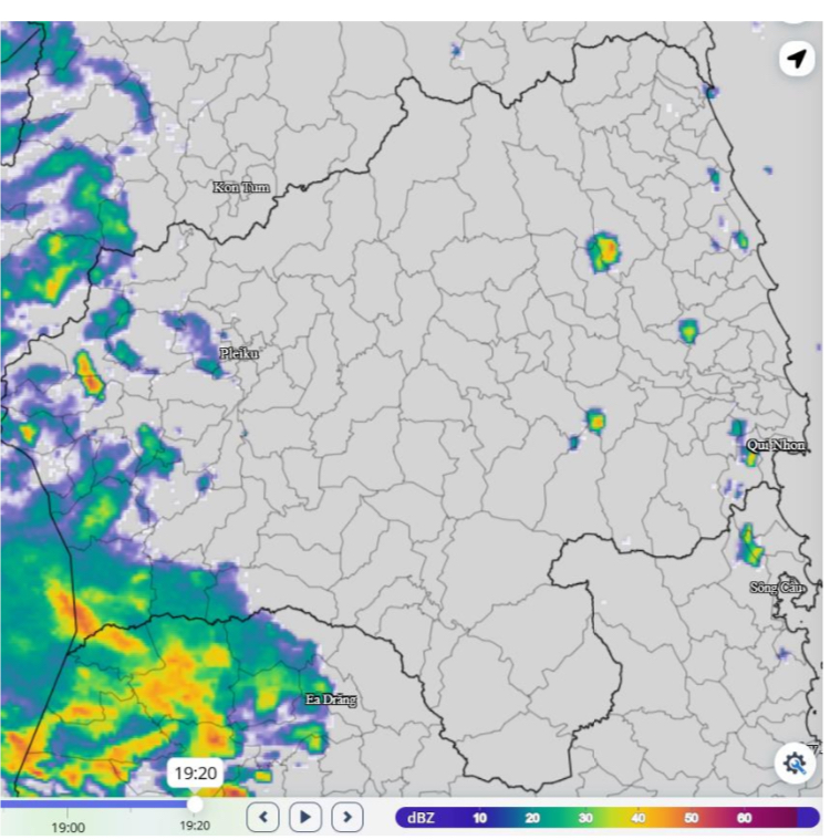 Hiện trạng trong 03 giờ qua: Phân tích trên ảnh mây vệ tinh, ảnh định vị sét và ảnh ra đa cho thấy mây đối lưu phát triển và gây mưa trên khu vực các phường, xã sau: Ia Grai, Ia Krái, Ia Hrung, Ia Chia, Ia O, Chư Păh, Ia Khươl, Đức Cơ, Ia Dơk, Ia Krêl, Ia Pnôn, Ia Dom, Ia Nan, Chư Prông, Bàu Cạn, Ia Boòng, Ia Lâu, Ia Tôr, Ia Púch, Ia Mơ, Kim Sơn, Phù Cát, Hòa Hội, Vĩnh Thịnh, Vĩnh Sơn. Hiện tại mây dông đang tiếp tục phát triển và mở rộng.