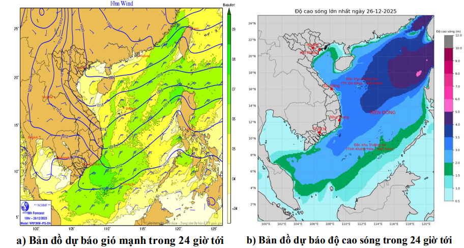 Dự báo tác động: Toàn bộ tàu thuyền và các hoạt động khác tại các vùng biển trên đều có nguy cơ cao chịu tác động của gió mạnh, sóng lớn. Đề phòng sạt lở bờ biển và những đê kè xung yếu khu vực ven bờ.